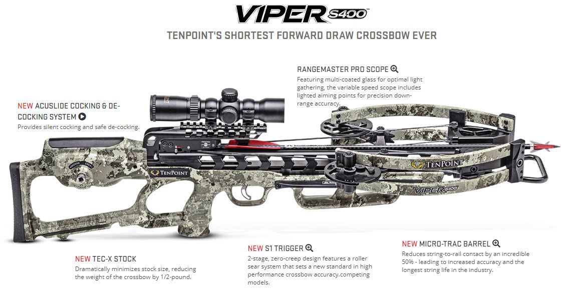 Complete with the revolutionary ACUslide silent cocking and safe de-cocking system, the TenPoint® Viper S400 delivers a lightweight 32” length and is TenPoint’s® shortest forward draw crossbow. Able to fire arrows out to 400 FPS and complete with a 3.5 pound 2-stage S1 trigger, Micro-Trac Barrel, and RangeMaster Pro scope for hairsplitting accuracy down range, the Viper S400 is silent, safe, maneuverable, and accurate.